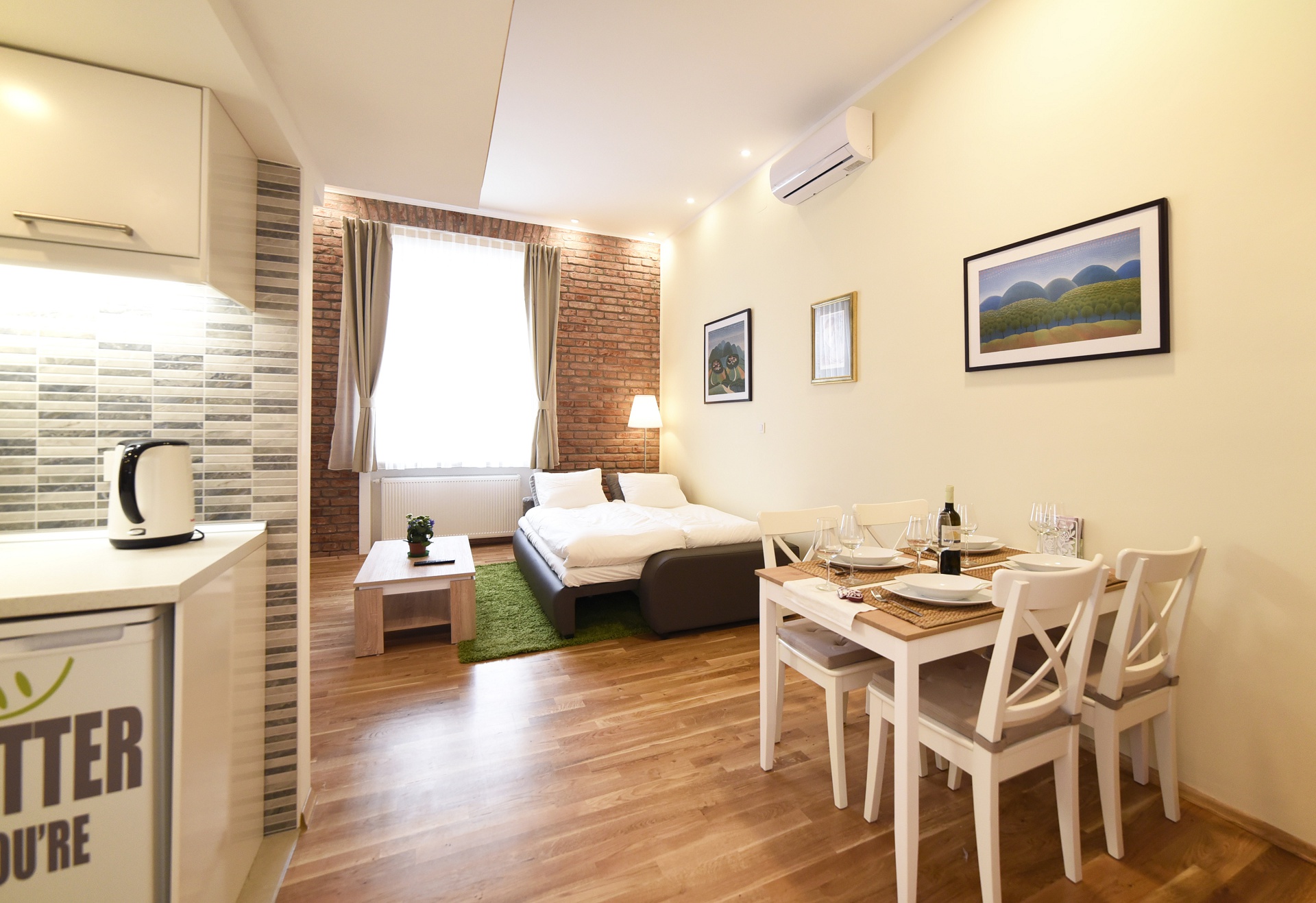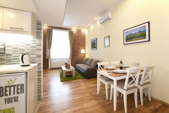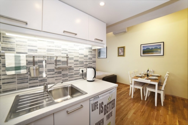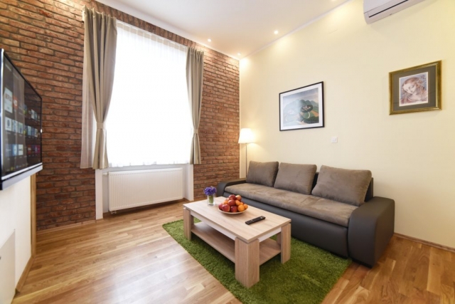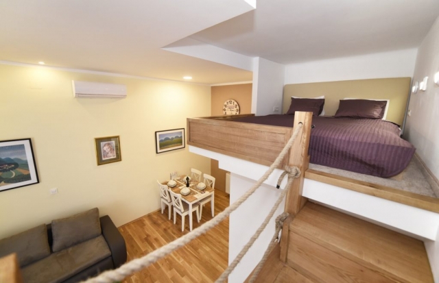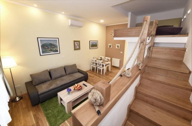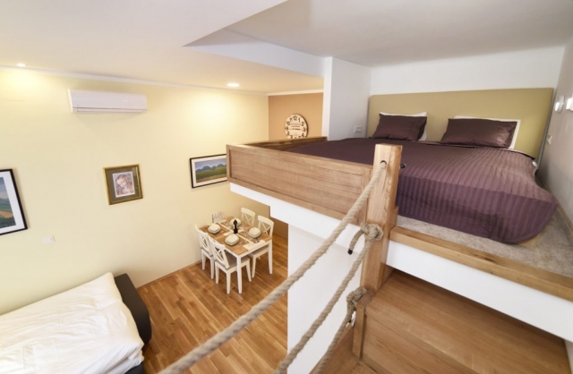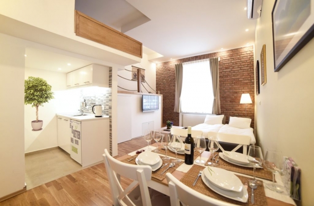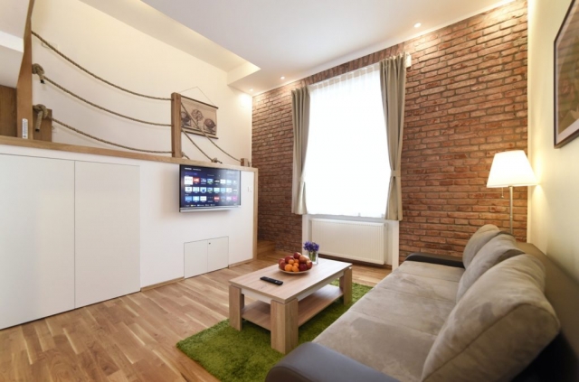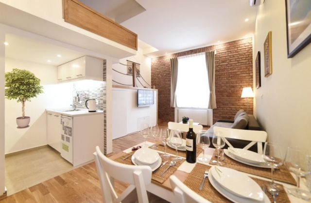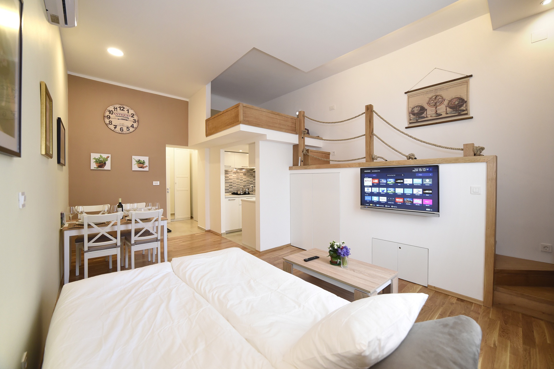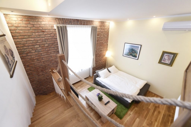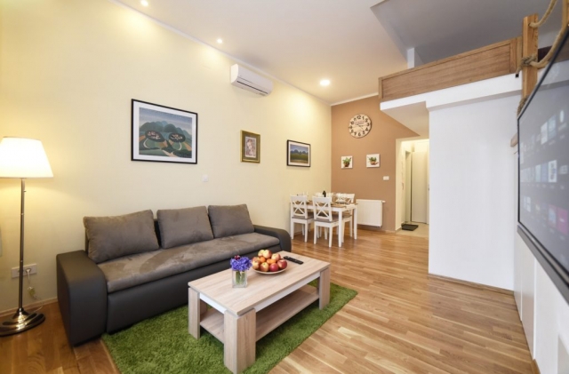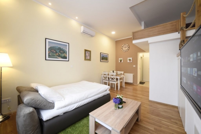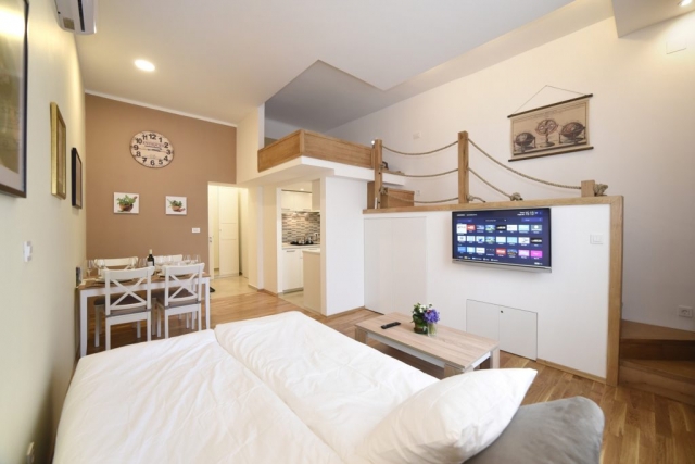 This studio apartment, located downtown in the city of Zagreb, has recently been stylishly and thoroughly refurbished to the highest standard.Its facilities include all you would expect from a five star apartment – a fully fitted kitchen, king size double bed in the upper loft, sofa in the living room, and a high pressure shower. The apartment comes with free WiFi and a smart TV.